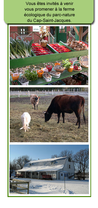 Vous êtes invités à venir vous promener à la ferme écologique du parc-nature du Cap-Saint-Jacques. La ferme est une vitrine sur le monde agricole. Vous pourrez y voir les infrastructures d'agriculture biologique (serre, jardins, champs et magasin général) ainsi que les nombreux animaux qui vivent en permanence sur le site et dans la grange de la ferme. On retrouve plusieurs 'espèces, telles que des lapins,des vaches, des chevaux, des chèvres, des moutons, des ânes, etc.